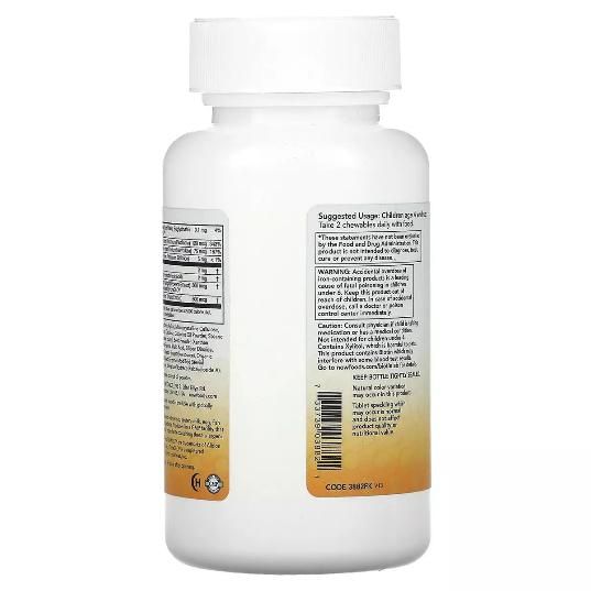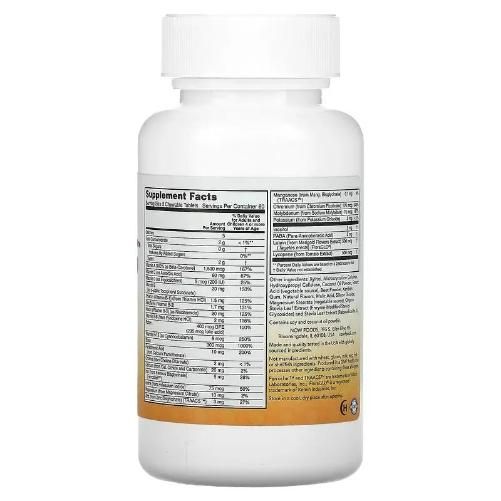 Состав: ксилитол, витамин A (100% в виде бета-каротина), витамин С (в виде аскорбиновой кислоты), витамин D (в виде эргокальциферола), витамин E (в виде d-альфа-токоферила сукцината), тиамин (витамин B1) (из тиамина гидрохлорида), рибофлавин (витамин B2), ниацин (витамин B3), витамин B6 (из пиридоксина гидрохлорида), фолат пищевого фолатного эквивалента (235 мкг фолиевой кислоты), витамин B12 (в виде цианокобаламина), ботин, пантотеновая кислота (из пантотената кальция), холин (из битартрата холина), кальций (из цитрата карбоната кальция), железо (из бисглицината железа) (Ferrochel™), йод (из йодида калия), магний (из цитрата магния), цинк (из бисглицината цинка) (TRAACS™), марганец (из марганца бисглицината) (TRAACS™), хром (из пиколината хрома), молибден (из молибдата натрия), калий (из хлорида калия), инозитол, ПАБК (пара-аминобензойная кислота), лютеин (из экстракта цветков бархатцев мелкоцветных) (Tagetes erecta) (FloraGLO®), ликопин (из экстракта томатов).
