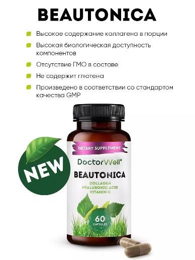 Раскройте свою внутреннюю красоту с помощью премиального комплекса Beautonica. Он содержит два мощных ингредиента для сияющей и молодой кожи и здоровых суставов: гиалуроновую кислоту и коллаген. Комплекс Beautonica помогает сохранить оптимальный уровень увлажненности кожи, замедлить процессы старения и формирования морщин, улучшает тургор кожи. Входящие в состав комплекса гиалуроновая кислота и коллаген представлены в низкомолекулярной форме, что обеспечивает высокую степень их усвоения организмом.