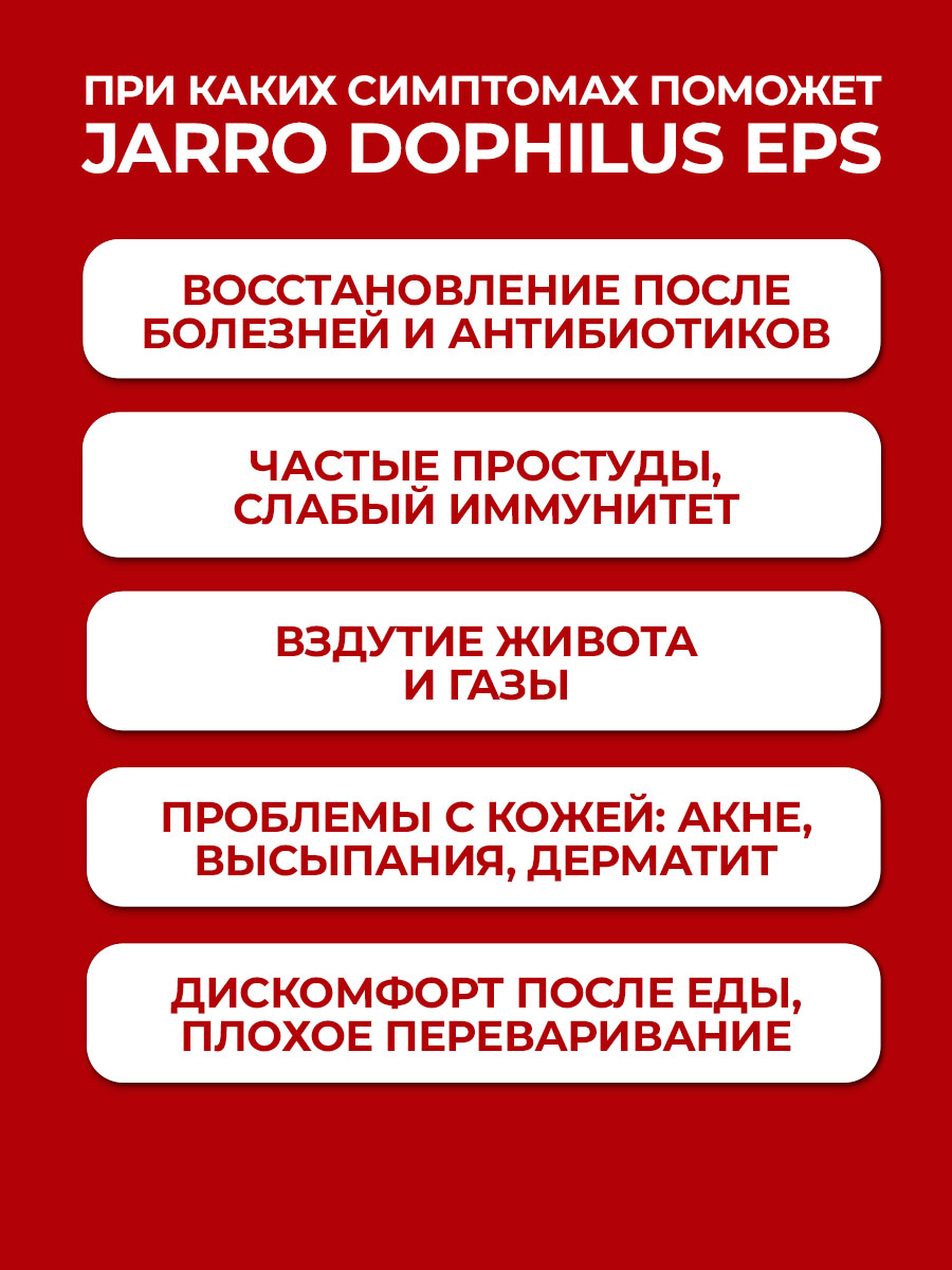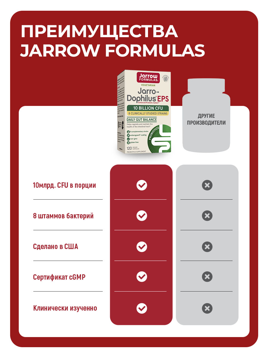 Jarro-Dophilus EPS — это комплекс из 8 клинически изученных штаммов пробиотиков, разработанный для поддержки здоровья кишечника и иммунитета.