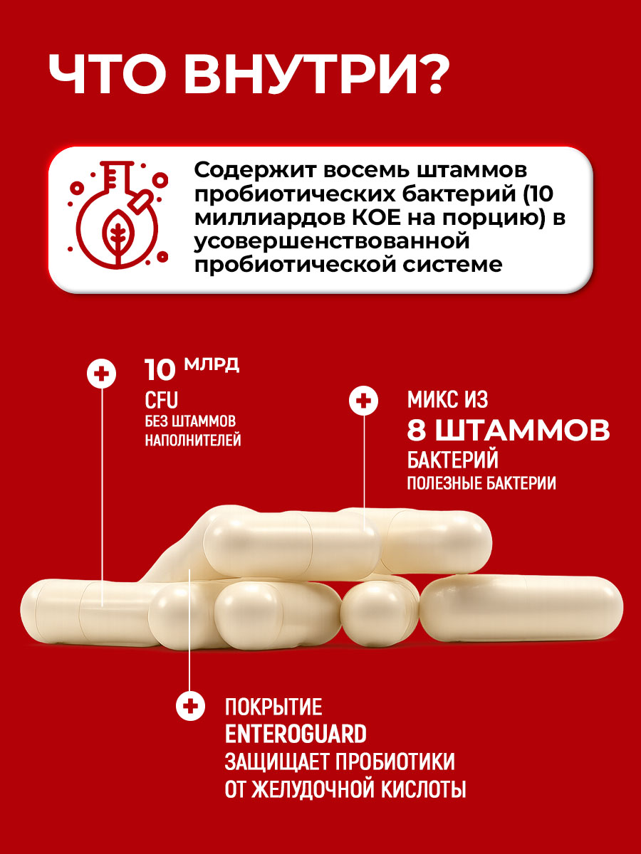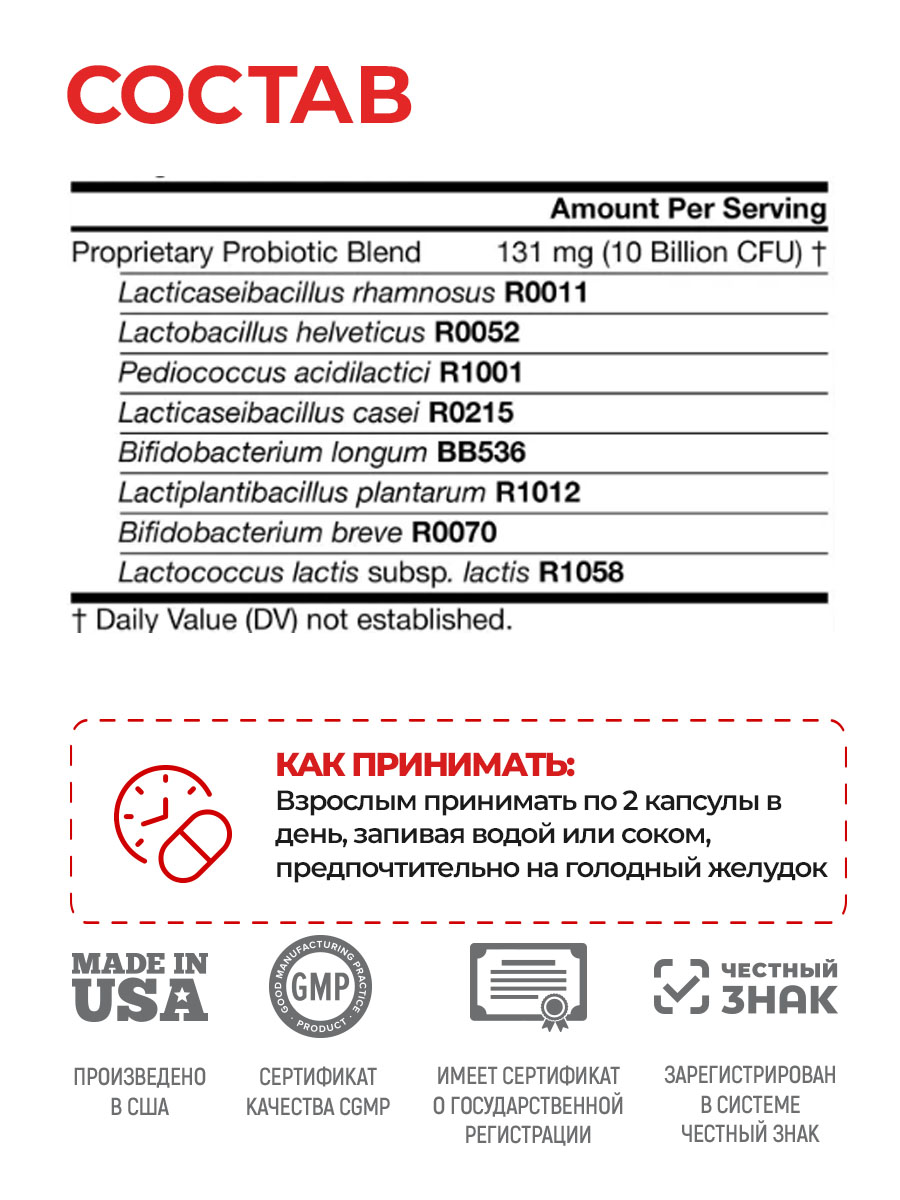 Состав: картофельный крахмал, капсула (загуститель гидроксипропилметилцелллоза Е464, вода), кишечнорастворимое покрытие капсулы (загуститель гидроксипропилметилцелллоза Е464, носитель этилцеллюлоза Е462, стабилизатор альгинат натрия Е401, среднецепочечные триглицериды (из кокосового масла), стабилизаторы жирные кислоты Е570 (олеиновая кислота, стеариновая кислота), пробиотическая смесь: Lactobacillus rhamnosus R0011, Lactobacillus helveticus R0052, Pediococcus acidilactici R1001, Lactobacillus casei R0215, Bifidobacterium longum ВВ536, Lactobacillus plantarum R1012, Bifidobacterium breve R0070, Lactococcus lactis subsp. Lactis R1058, антислеживающий агент магниевая соль стеариновой кислоты Е470b, антиокислитель аскорбиновая кислота Е300).