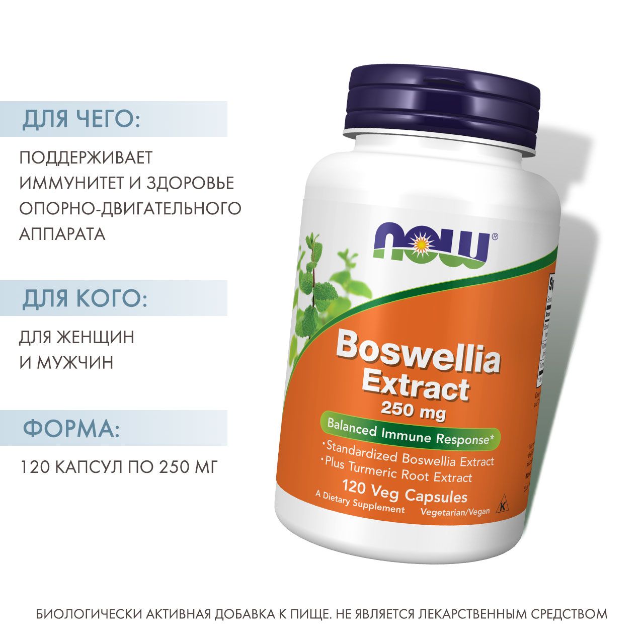 Экстракт Босвеллии NOW® - это стандартизированный экстракт босвеллии серрата, также известный как ладан, растительный экстракт, традиционно используемый аюрведическими травниками на протяжении веков. В научных исследованиях было показано, что биоактивные составляющие босвеллии, босвелловые кислоты, влияют на ключевые ферменты, участвующие в поддержании здоровых тканей. С помощью этих механизмов босвеллия может естественным образом поддерживать сбалансированную реакцию иммунной системы на внутренний метаболический стресс. Оказывает мощный противовоспалительный эффект, особенно результативна при воспалительных заболеваниях опорно-двигательной системы.