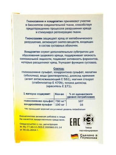 Показания к применению: дополнительный источник глюкозамина и хондроитин сульфата; комплекс глюкозамина и хондроитина может применяться для улучшения состояния при дегенеративно-дистрофических заболеваниях суставов и позвоночника (остеоартроз, остеохондроз).