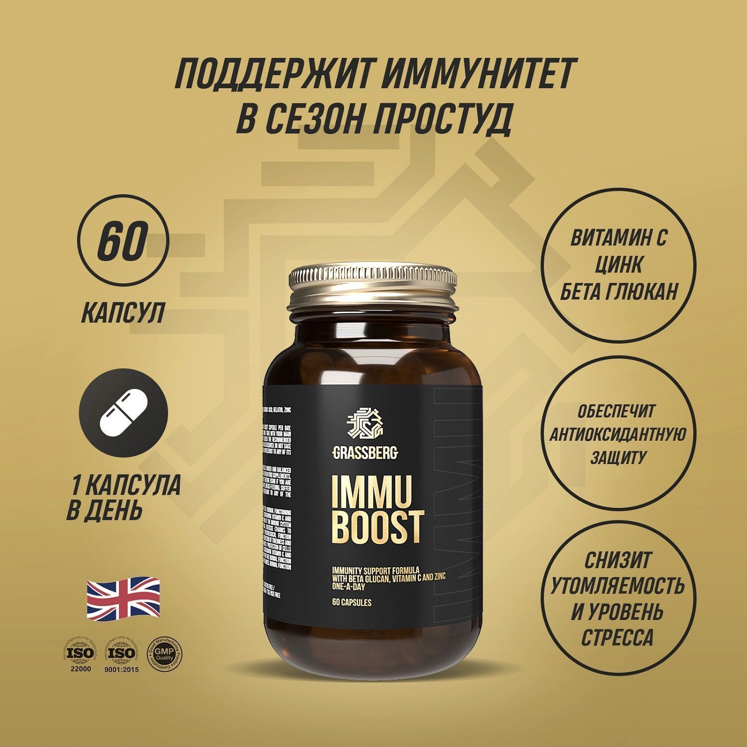 Immu Boost – добавка направленная на построение крепкого иммунитета и профилактики простудных и вирусных заболеваний. В составе комплекса эффективные иммуномодуляторы для построения крепкого иммунитета. Регулярный прием добавки Immu Boost позволит: