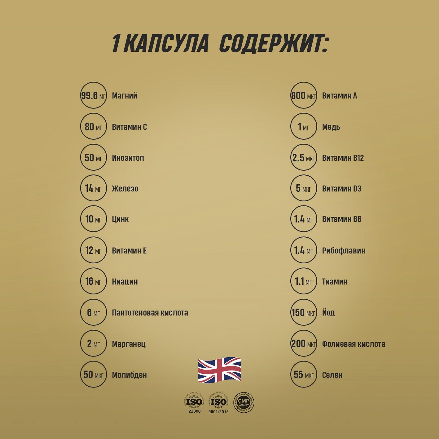 Магний 99,6 мг, витамин С 80 мг, инозитол 50 мг, железо 14 мг, цинк 10 мг, витамин Е 12 мг, ниацин 16 мг, пантотеновая к-та 6 мг, марганец 2 мг, витамин А 800 мкг, медь 1 мг, витамин В12 2,5 мкг, витамин Д3 5 мкг, витамин В6 1,4 мг, рибофлавин 1,4 мг, тиамин 1,1 мг, йод 150 мкг, фолиевая к-та 200 мкг, молибден 50 мкг, селен 55 мкг, биотин 50 мкг.