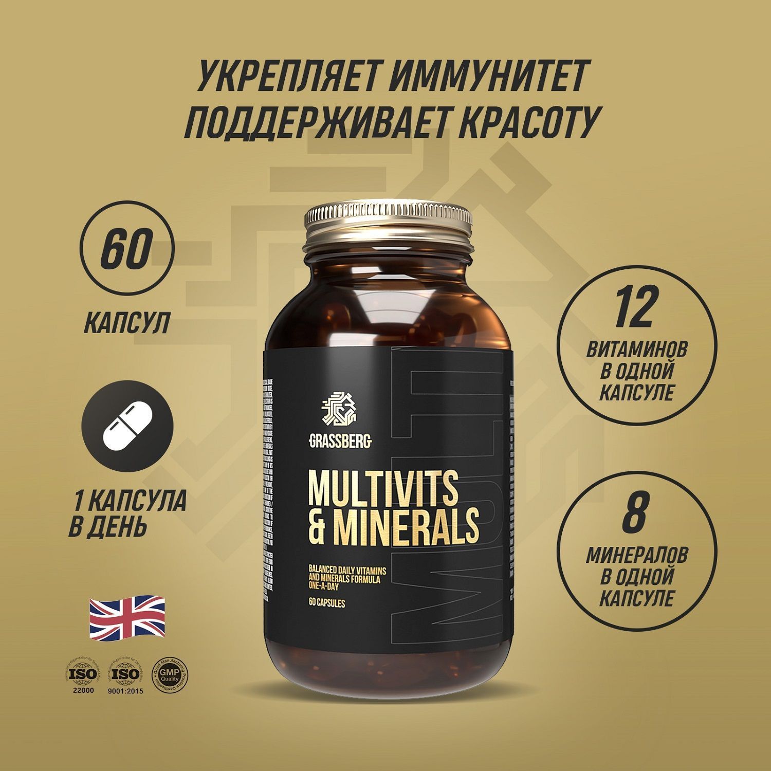Multivit & Minerals – витаминно-минеральный комплекс для всесторонней поддержки организма. В основе комплекса макро и микро-элементы в оптимальных дозировках, комплекс является собственной научной разработкой GrassBerg.