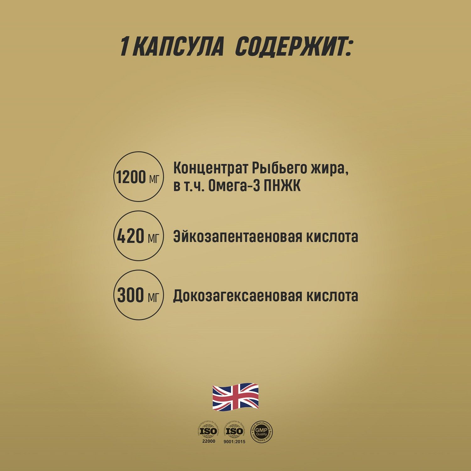 Концентрат рыбьего жира 1200 мг (ЭПК эйкозапентаеновая кислота 450 мг, ДГК докозагексаеновая кислота 250 мг, антиокислитель концентрат смеси токоферолов Е306 4,4 мг).