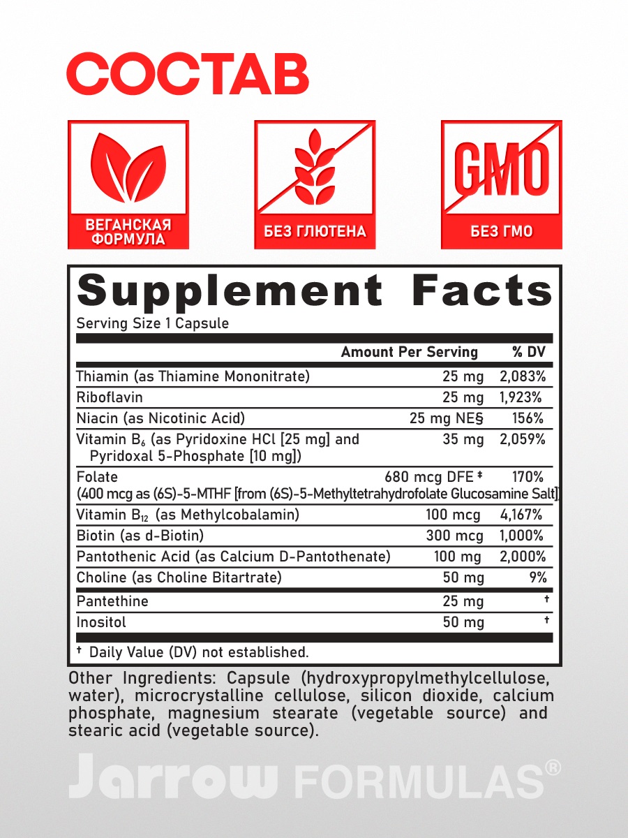 Состав: пантотеновая кислота (витамин В5 в виде D-пантотената кальция), холин (в виде битартрата холина), гидроксипропилметилцеллюлозы (капсула), инозитол, витамин В6 (в виде пиридоксина HCl [25 мг] и пиридоксаль 5-фосфата [10 мг]), целлюлоза (носитель), тиамин (витамин В1 в виде мононитрата тиамина), эмульгаторы (диоксид кремния, фосфат кальция), пантетин (производное витамина В5), стабилизатор (стеарат магния (растительного происхождения)), рибофлавин (витамин В2), ниацин (витамин В3 в виде никотиновой кислоты), наполнитель (стеариновая кислота (растительного происхождения)), фолиевая кислота (в виде четырехфолиевой (6S)-5-Метилтетрагидрофолат Глюкозаминовая соль), биотин (в виде d-биотина), витамин В12 (в виде метилкобаламина).
