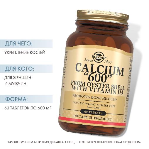 Таблетки с содержанием Кальция 600 (из раковин устриц) разработаны американской компанией Solgar. Является биологически активной добавкой (БАД). Назначение - дополнительный источник кальция для организма, оказывающий положительное воздействие на увеличение плотности костей и нормальному функционироваю мышц.
