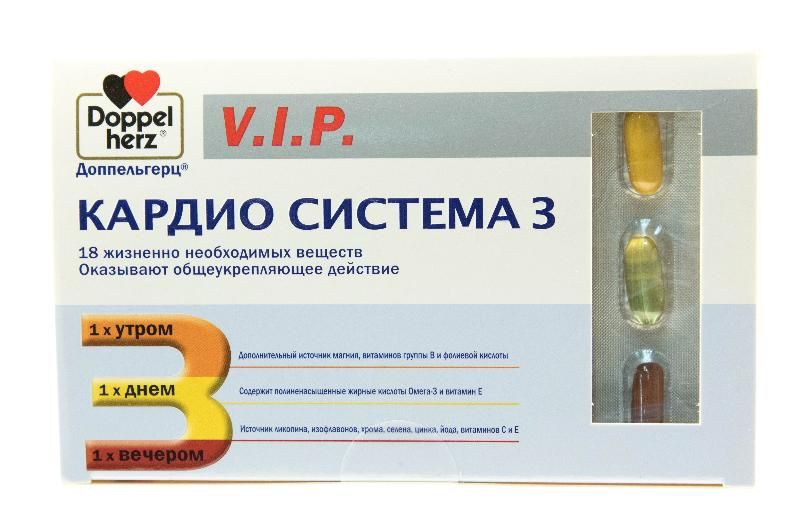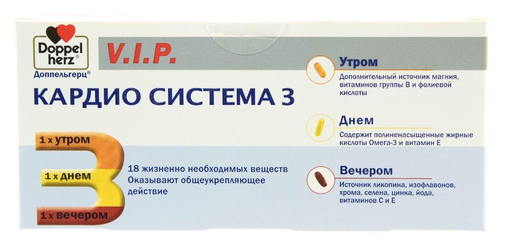 Доппельгерц® V.I.P. Кардио Система 3 это специально разработанная комбинация целого спектра биологически активных веществ (18 показателей), способствующая на протяжении всего дня снабжению организма питательными веществами, необходимыми для выработки энергии, повышения иммунитета и защиты клеток. Улучшает баланс липидных показателей крови, нормализует уровень холестерина и улучшает функциональную деятельность сердечно-сосудистой системы. Источник ликопина, изофлавонов, дополнительный источник магния, хрома, селена, цинка, йода, витаминов С, Е, фолиевой кислоты, В1 , В2, В3, В5, В6, В12, биотина, полиненасыщенных жирных кислот Омега-3. Для коррекции уровня холестерина в крови и улучшения функциональной деятельности сердечно-сосудистой системы. Для повышения иммунитета и защиты клеток организма, улучшение энергетического обмена веществ.
