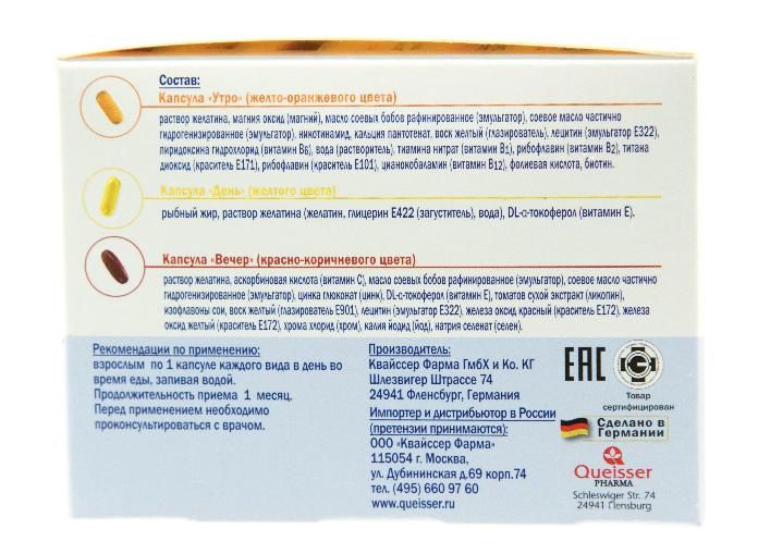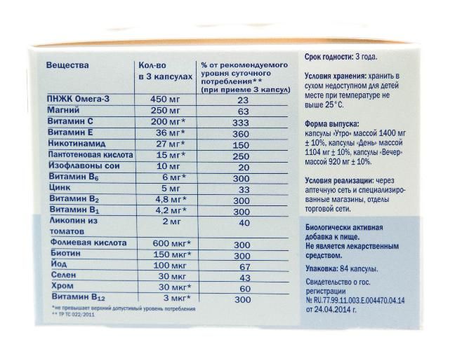 1 капсула «Утро» (желто-оранжевого цвета) содержит: 250 мг магния оксида, 20 мг лецитина, 27 мг, никотинамида, 15 мг кальция пантотената (витамина В5), 6,0 мг пиридоксина гидрохлорида (витамин В6), 4,8 мг рибофлавина (витамин В2), 4,2 мг тиамина мононитрата (витамин В1), 600 мкг фолиевой кислоты, 150 мкг биотина, 3,0 мкг цианокобаламина (витамин В12). Вспомогательные компоненты: масло соевых бобов, парциальный гидрат масла соевых бобов, воск желтый, желатин, глицерол, сорбитол, очищенная вода, титана диоксид, рибофлавин. 1 капсула «День» (желтого цвета) содержит: 450 мг рыбного жира (полиненасыщенные жирные кислоты Омега-3), 10 мг альфа-токоферола (витамин Е). Вспомогательные компоненты: желатин, глицерол, очищенная вода. 1 капсула «Вечер» (красно-коричневого цвета) содержит: 200 мг аскорбиновой кислоты (витамин С), 26 мг альфа-токоферола (витамин Е), 10 мг изофлавонов, 5 мг цинка глюконата, 2 мг ликопина из экстракта томатов, 100 мкг калия йодида, 30 мкг натрия селената, 30 мкг хлорида хрома. Вспомогательные компоненты: лецитин, масло соевых бобов, парциальный гидрат масла соевых бобов, воск желтый, желатин, глицерол, сорбитол, очищенная вода, железа оксид красный, железа оксид желтый.