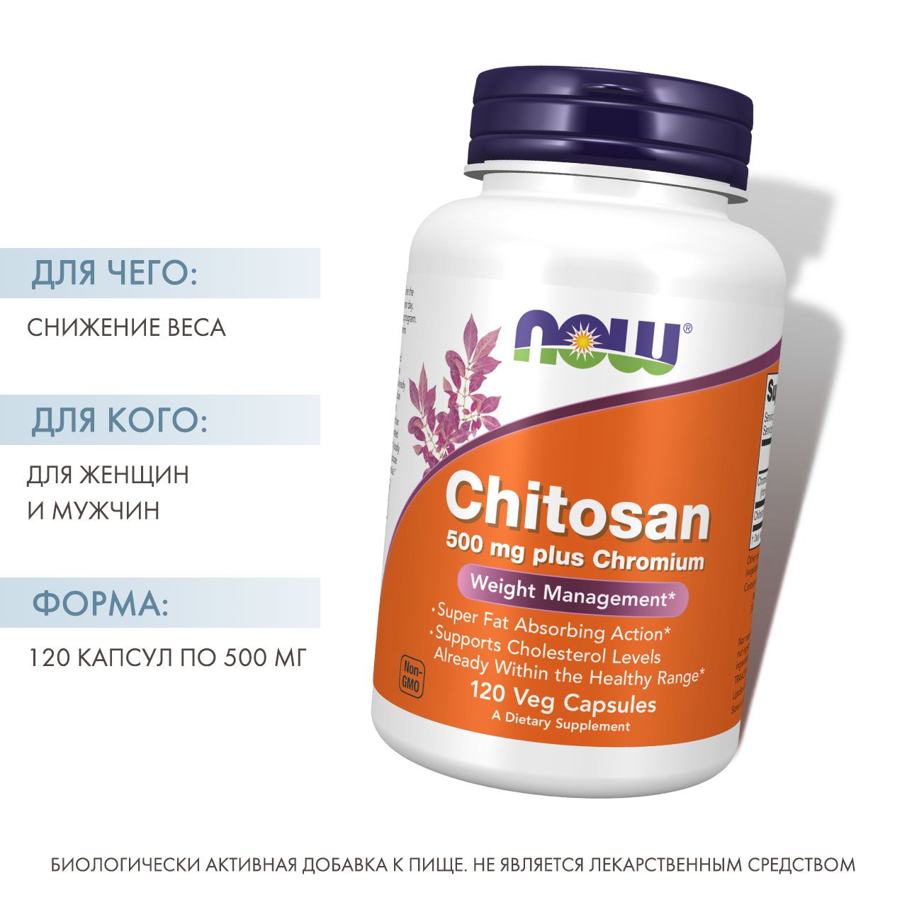 В течение многих лет хитозан активно используется в диетологии и медицине. Его применение в составе пищевых добавок помогает в борьбе с недомоганиями, проявляемыми в виде гипертонии, повышенного уровня холестерина в крови, аллергических реакций и артритов. Применение препарата улучшает состояние кожных покровов, волос и ногтей. Сhitosan NOW способствует выведению жиров, которые поступают вместе с пищей ещё до момента их усвоения. Благодаря данной особенности: снижается вес тела из-за расходования организмом собственного жирового запаса, необходимого для липидного обмена веществ; естественным образом приходит в норму уровень холестерина. Помимо борьбы с лишним весом, при введении в рацион Now Хитозана в качестве пищевой добавки нормализуется: давление (благодаря усвоению кальция и снижению концентрации хлоридов); уровень глюкозы в крови посредством улучшения обмена веществ. Неоценимую роль играет БАД Хитозан в работе ЖКТ, при его участии в кишечнике: поддерживается в норме количество бифидо- и лактобактерий; улучшается перистальтика. Хитозан помогает процессу выведения из организма: солей свинца, ртути и канцерогенов, которые провоцируют развитие злокачественных образований; токсинов при всех видах интоксикации; радионуклидов и прочих соединений, накапливаемых в организме и медленно его отравляющих. БАД Хитозан имеет сбалансированный состав, в который помимо основного вещества входит хром – микроэлемент, регулирующий жировой и углеводный обмены в организме, а также способствует синтезу необходимых для работы миокарда ферментов.