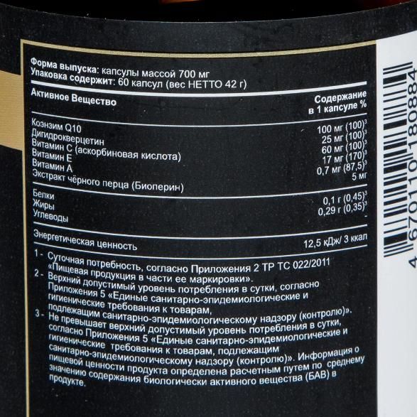 Состав: масло оливковое нерафинированное, убихинон (коэнзим q10), витамин С (Аскорбиновая кислота), дигидрокверцетин, витамин Е, Экстракт чёрного перца (Биоперин), Витамин А, моностеарат глицерина (эмульгатор), оболочка (желатин, агент влагоудерживающий глицерин, вода очищенная).
