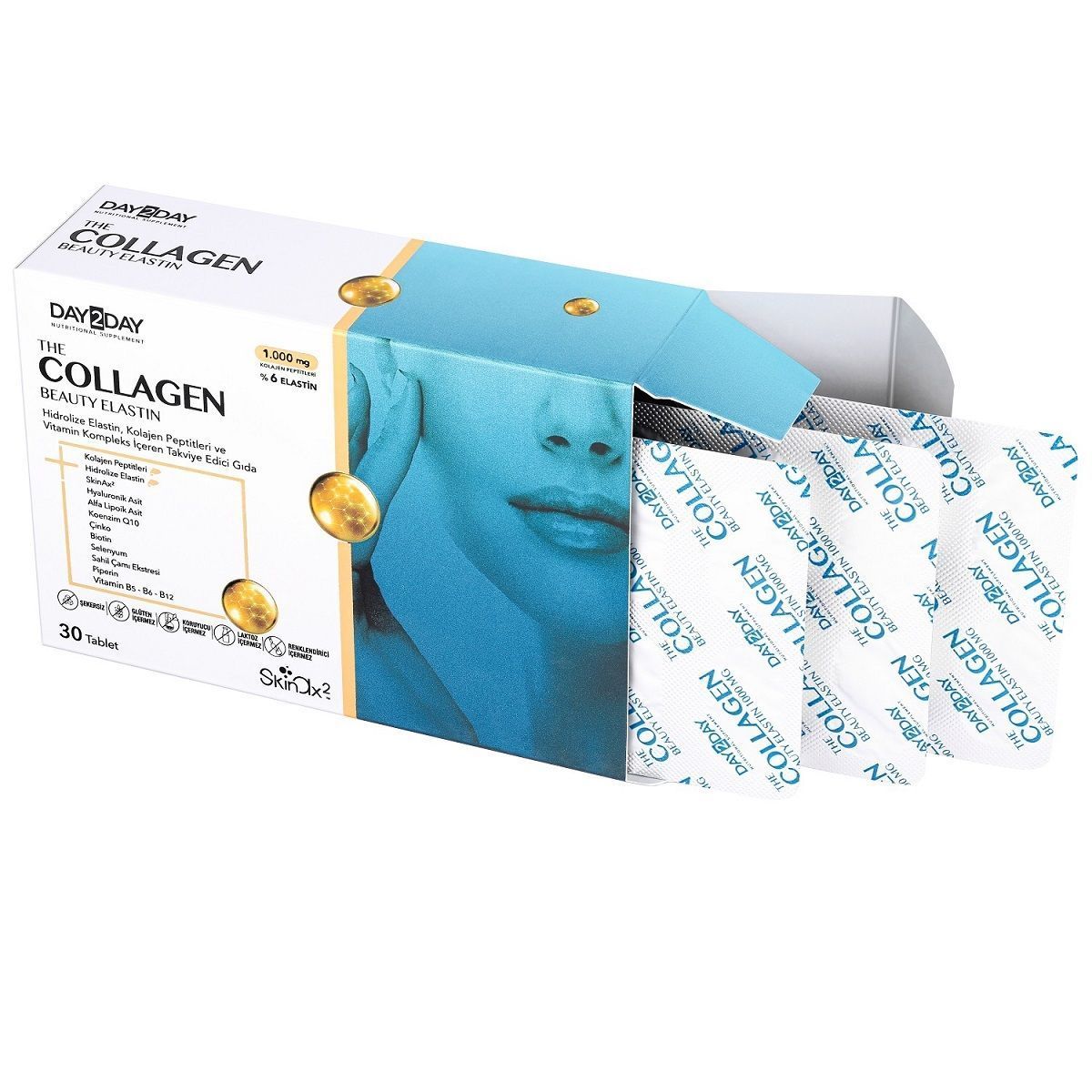 Day2Day Коллаген Бьюти Эластин — это пищевая добавка в форме таблеток, каждая из которых содержит 1 063,83 мг гидролизованных пептидов коллагена I типа рыбьего и пептидов эластина. Также в состав входит французская запатентованная антивозрастная формула SkinAx2, которая включает первичные и вторичные антиоксиданты, необходимые для молодости кожи.