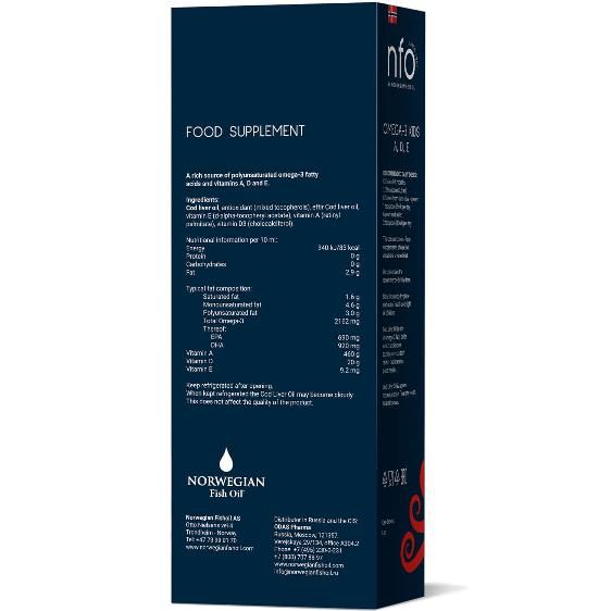 Жир печени трески – один из самых ценных, обладает широким спектром благотворного воздействия на организм. Особенно ценным считается высокоочищенный жир печени трески из рыбы, выросшей в свободных условиях, а не искусственно выращенной. Для производства комплекса Omega-3 Cod Liver Oil используется жир печени дикой трески, выловленной в Норвежском море. Не является лекарственным средством.