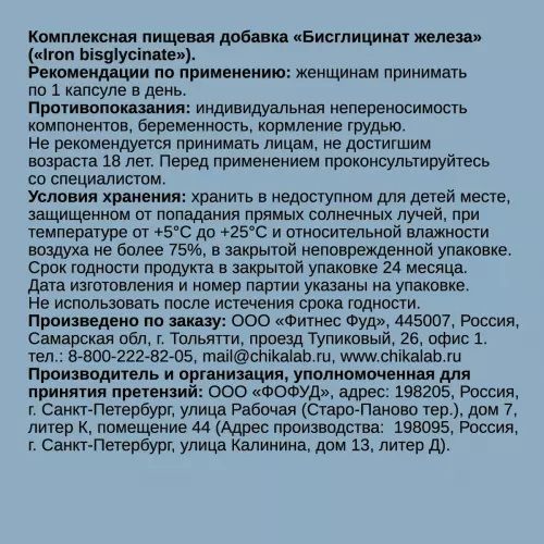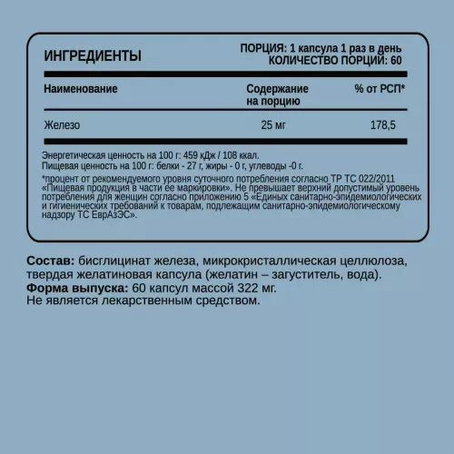 Состав: бисглицинат железа, микрокристаллическая целлюлоза, твердая желатиновая капсула (желатин – загуститель, вода).