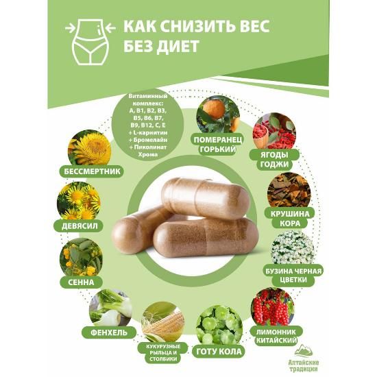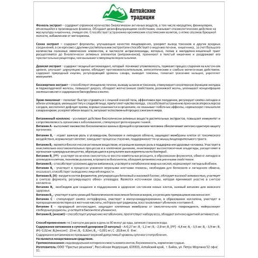 Состав: экстракт плодов померанца горького, L-карнитин, экстракт ягод годжи, бромелайн, бузина черная цветки экстракт, китайский лимонник семена экстракт, готу кола трава экстракт, витаминный премикс (витамины А, В1, В2, В3 (РР),  В5, В6, В7 (Н), В8(инозит), В9, В12,С, Е), кукурузные рыльца и столбики экстракт, фенхель плоды экстракт, сенна трава экстракт, девясил высокий корни и корневища экстракт, бессмертник цветки экстракт, пребиотик (из корней цикория), хром пиколинат, капсула (желатин)