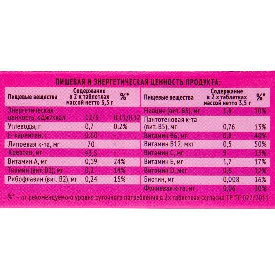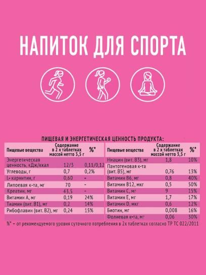 Эффективная тренировка - идеальный результат! Изотонический напиток от обезвоживания во время занятия спортом. Содержит комплекс компонентов, которые ускоряют метаболизм жиров в организме - карнитин, липоевая кислота и креатин, а также комплекс витаминов: группы B, А, Е, С, Н, РР, фолиевая кислота. Можно применять во время занятий фитнесом, активных танцев (например Зумба), теннисом, йогой и другими видами спорта. Компактный размер упаковки - удобно хранить.