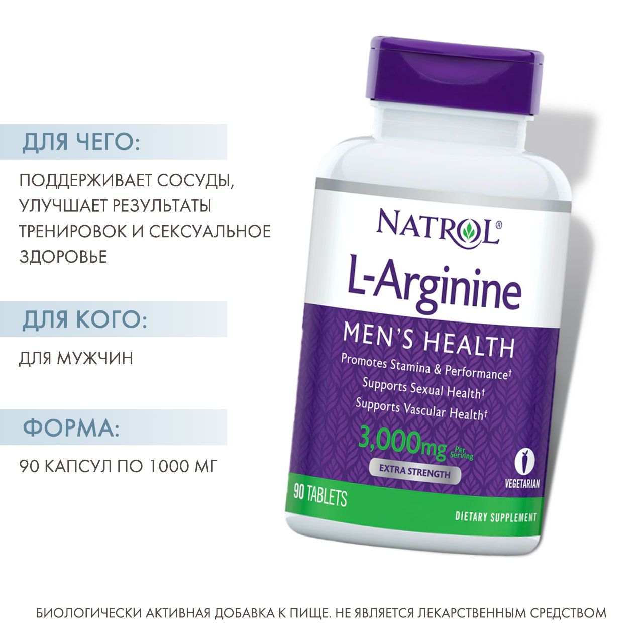 L-аргинин способствует улучшению сексуального здоровья (вазолидация), полезен для сосудов, способствует росту мышечной массы, эффективности спортивных занятий и полезен для иммунной функции. Клинические исследования свидетельствуют, что 3000 мг L-аргинина — оптимальное количество для поддержки здоровья сосудов и эректильной функции. Добавленные витамины группы B (B-6, B-9, B-12) необходимы для производства энергии.