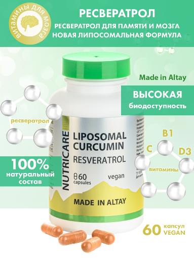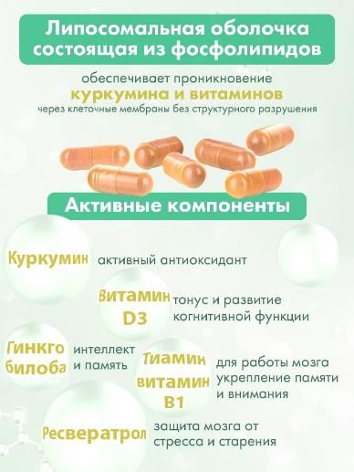 Новая липосомальная форма куркумина, обладающая исключительной эффективностью, с усиленной формулой ресвератрол, гинкго билоба, полифенолы, значительно повысила биодоступность куркумина и витаминов.