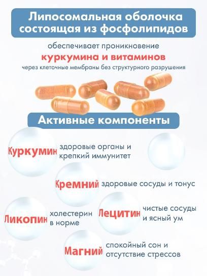 Новая липосомальная форма куркумина, обладающая исключительной эффективностью, с усиленной формулой ликопин, магний, лецитин подсолнечный, значительно повысила биодоступность куркумина и минералов.