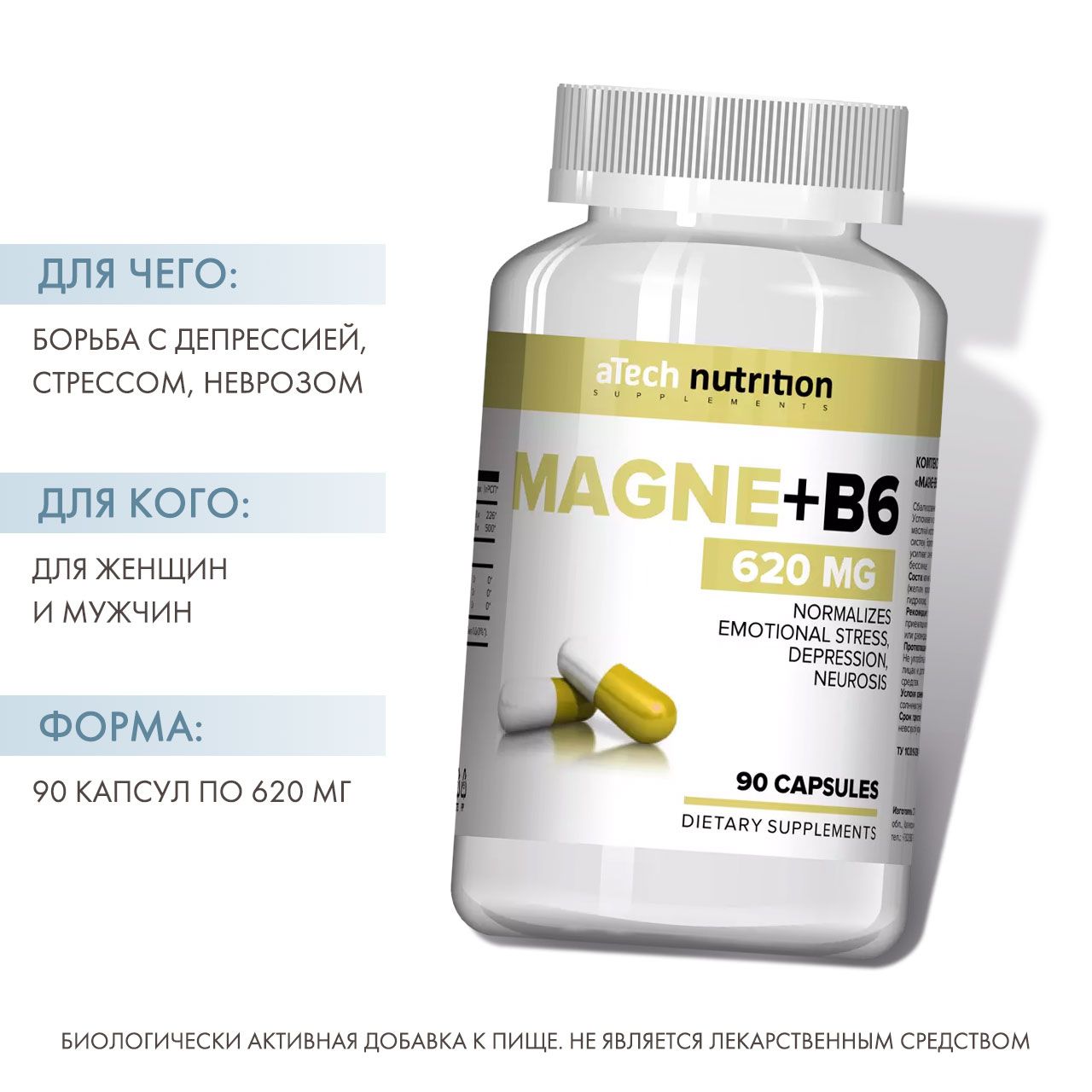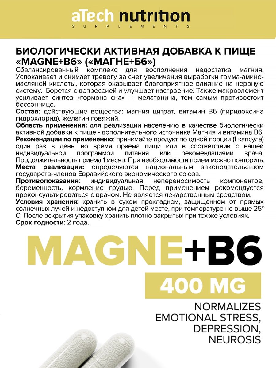 Сбалансированный комплекс для восполнения недостатка магния. Успокаивает и снимает тревогу за счет увеличения выработки гамма-аминомасляной кислоты, которая оказывает благоприятное влияние на нервную систему. Борется с депрессией и улучшает настроение. Также макроэлемент усиливает синтез "гормона сна" - мелатонина, тем самым противостоит бессоннице.