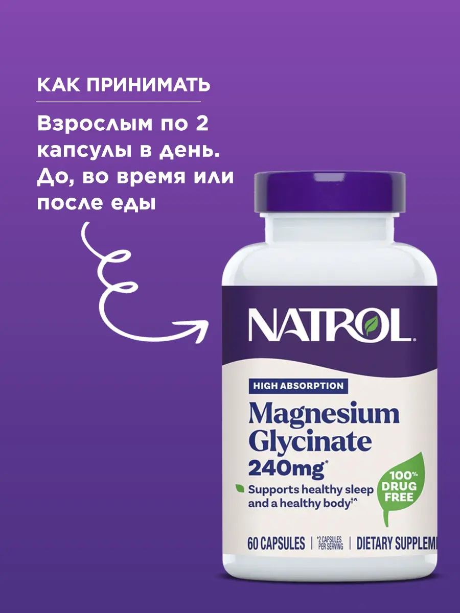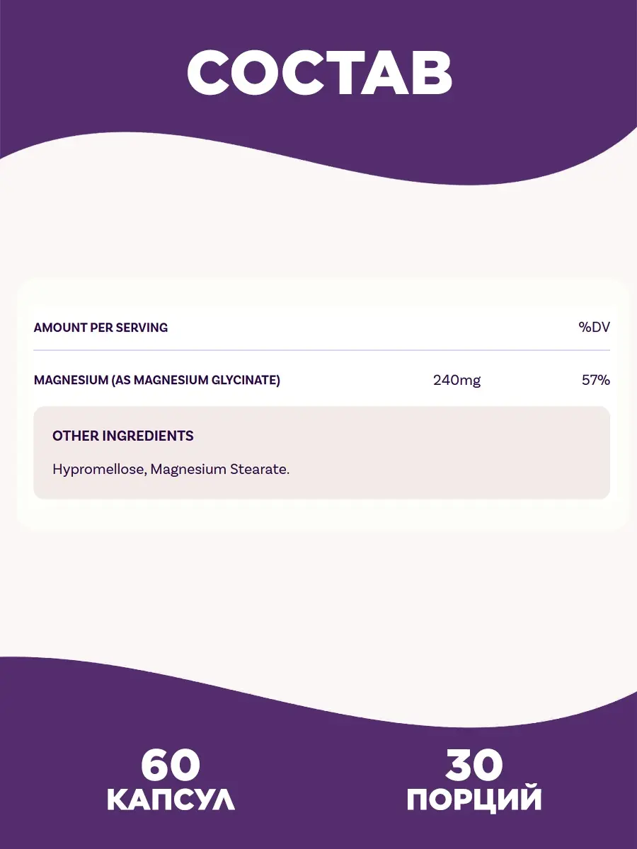 Магния глицинат — это высокобиодоступная форма магния, которая отличается мягким воздействием на желудок. Не является лекарственным средством.