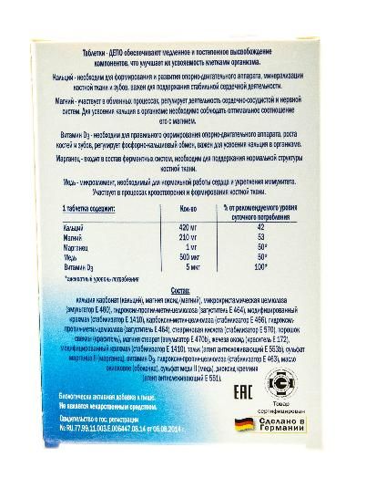 Комплекс способствует нормализации обмена и устранению дефицита кальция и магния. Магний – является важнейшим макроэлементом. Необходим для обеспечения многих энергетических процессов, участвует в обмене белков, жиров, углеводов и нуклеиновых кислот. Кальций - является главным элементом костной и зубной ткани, участвует в регуляции проницаемости клеточных мембран, процессе свертывания крови, необходим для поддержания стабильной сердечной деятельности. Таблетки – ДЕПО обеспечивают медленное и постепенное высвобождение компонентов, что обеспечивает их максимальную усвояемость клетками организма.