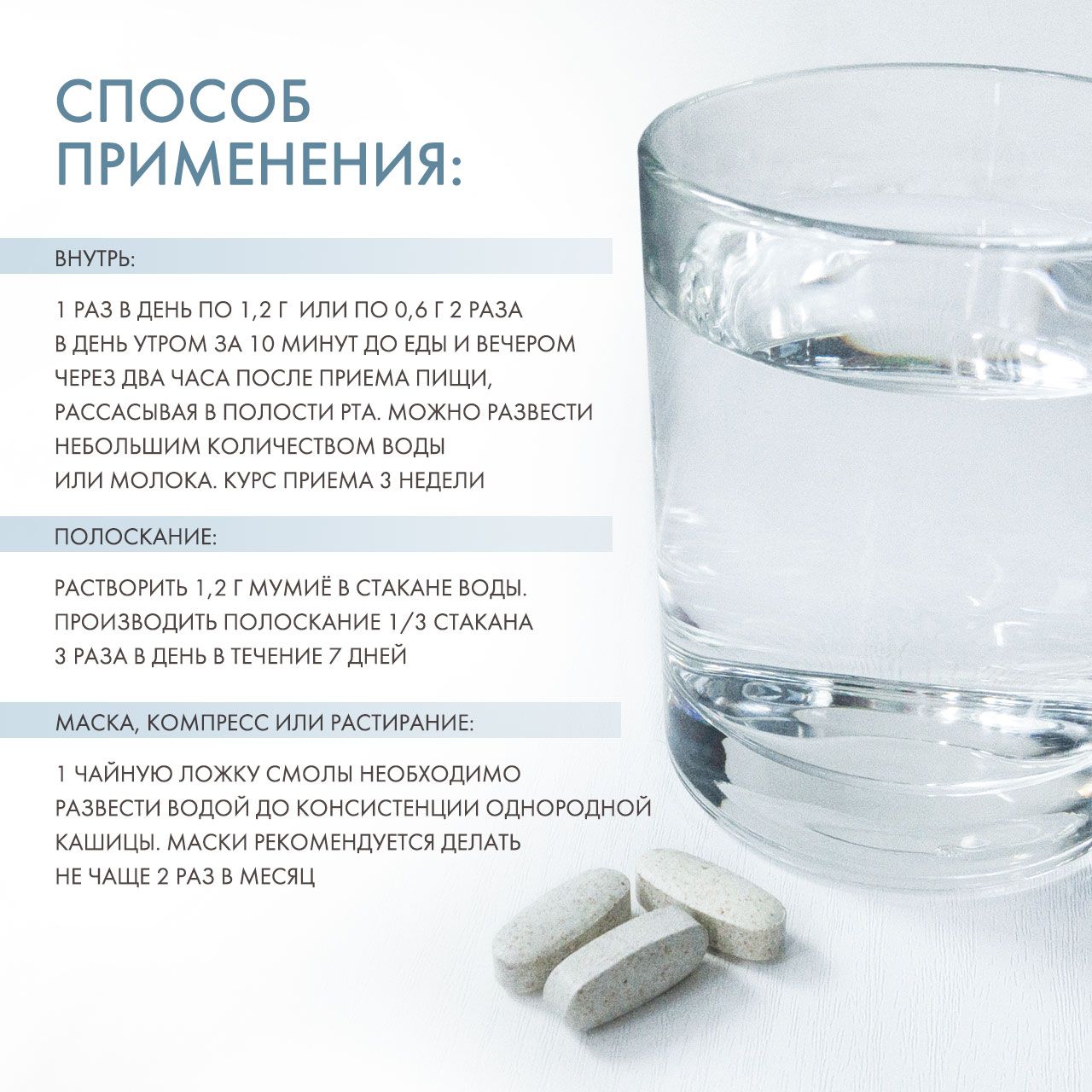 Использование в качестве полосканий при воспалительных процессах в полости рта: растворить 1,2 г мумиё в стакане воды. Производить полоскание 1/3 стакана 3 раза в день в течение 7 дней.