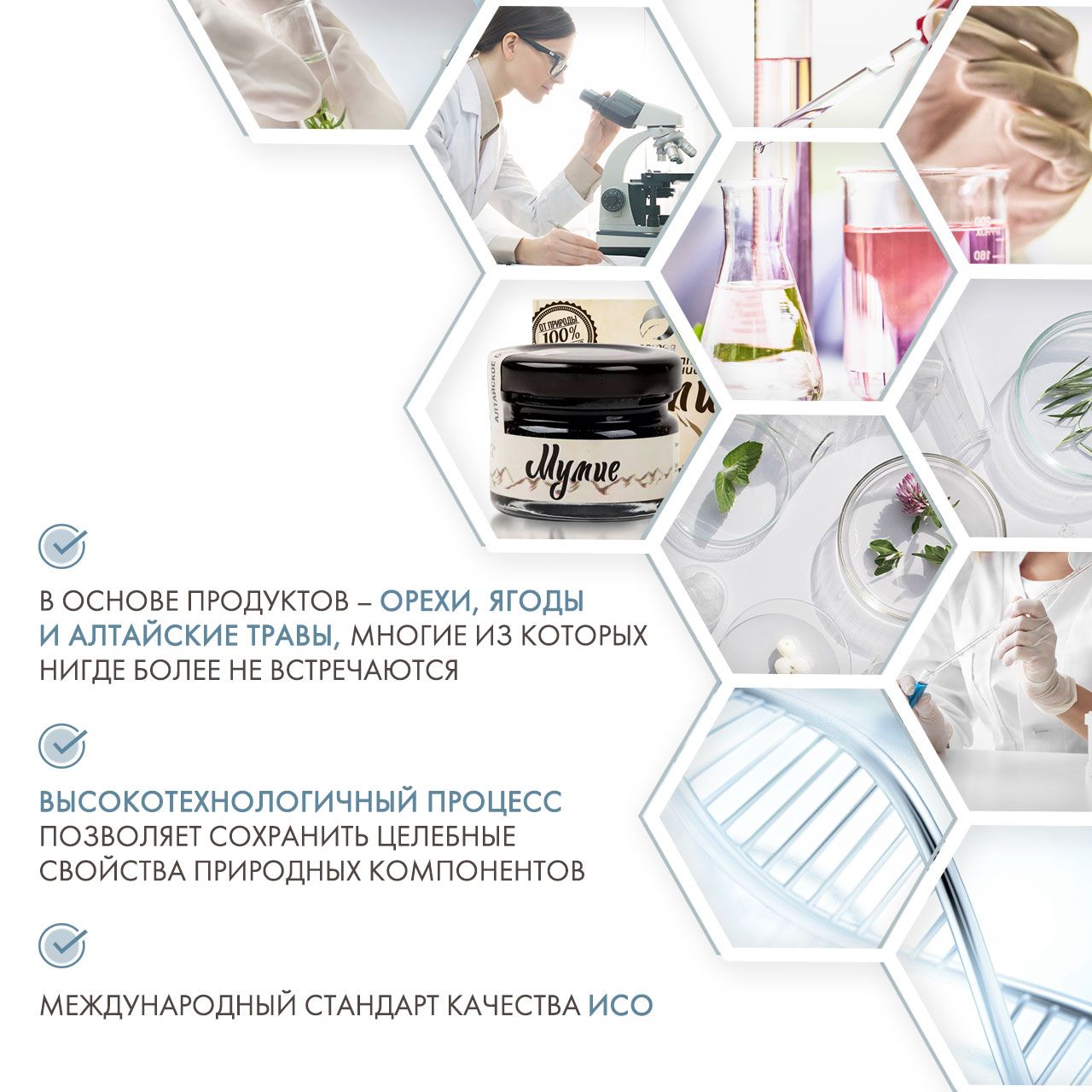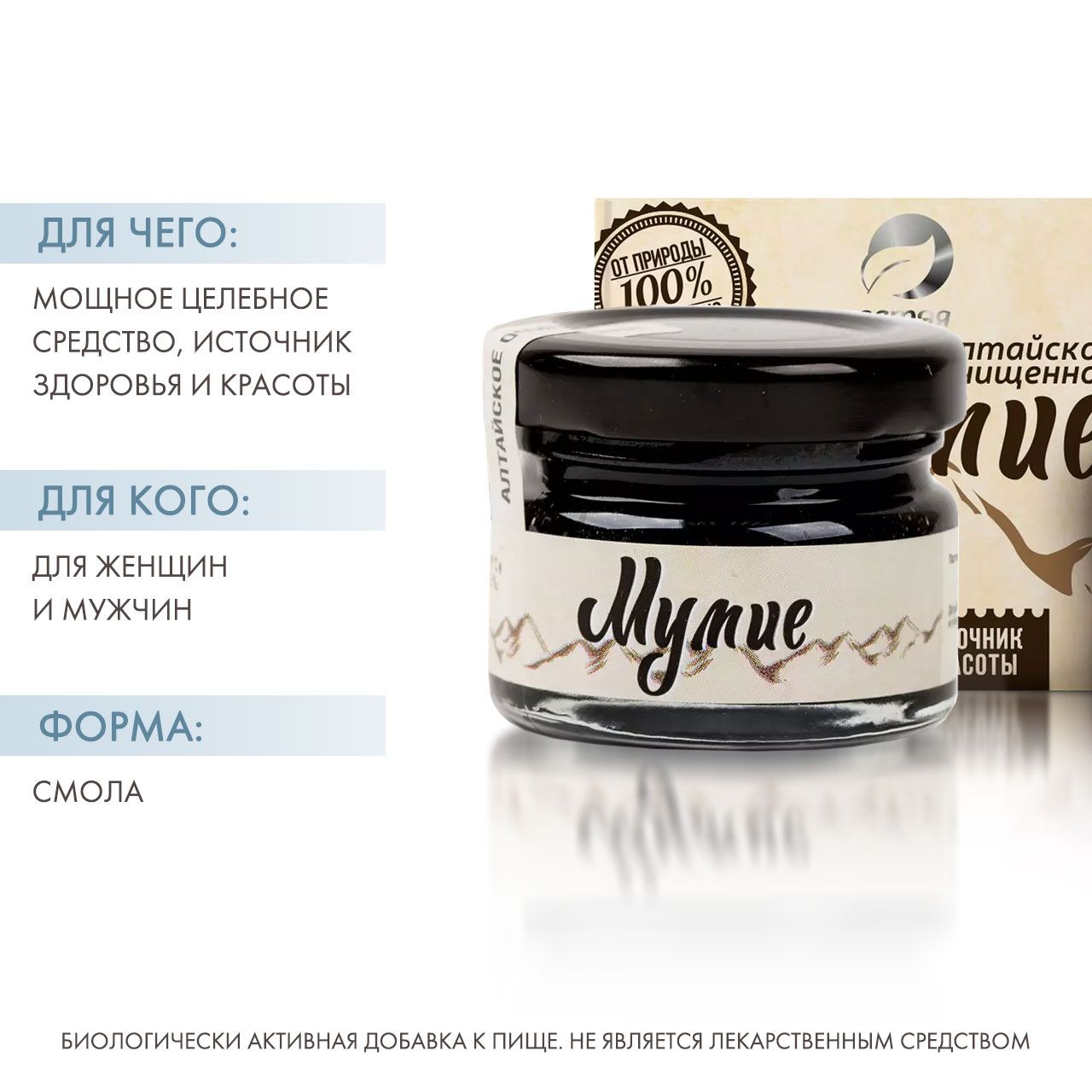 Мумиё – целебный дар природной аптеки – содержит в себе до 60 микроэлементов, а также около 30 органических и минеральных соединений, аминокислоты и витамины. Все эти элементы веками формируют мумиё в природных кладовых Горного Алтая, наполняя состав смолы силой и духом гор.