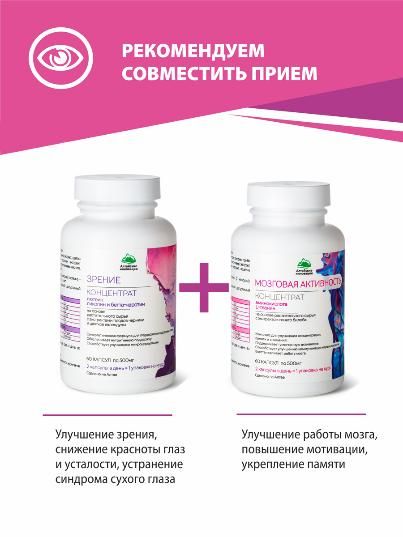 Натуральный комплекс концентрированных растительных экстрактов в сочетании с лютеином, ликопином и бета-каротином оказывает органам зрения необходимую нутритивную поддержку. Концентрат улучшает кровоток в мелких сосудах, поддерживает нормальное состояния сетчатки.