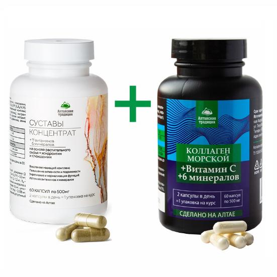 Концентрат "Суставы": сабельник трава экстракт, хондроитин сульфат, глюкозамин сульфат, витаминный комплекс (витамины А, В1, В2, В3 (РР), В5, В6, В7 (Н), В9, В12,С, Е), экстракт корня женьшеня, минеральный комплекс (железо сульфат, цинк оксид, медь сульфат, селен (селенит натрия), йод (калия йодат), марганец сульфат), экстракт золотого корня (родиолы розовой), куркума корень экстракт, калган корень экстракт, экстракт корней одуванчика, сенна трава экстракт, экстракт травы хвоща, капсула (желатин).