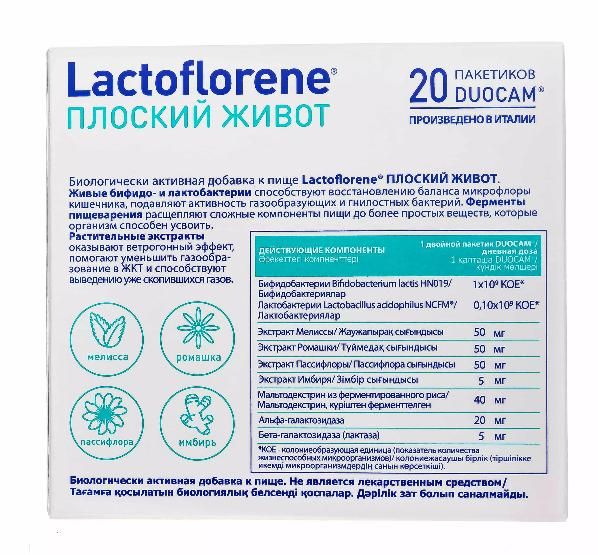 Биологически активная добавка "Плоский живот", 2 х 20 пакетиков: Lactoflorene "Плоский живот" – итальянская биодобавка для легкого пищеварения без вздутия живота. Помогает усвоению пищи, устраняет причины возникновения метеоризма и нормализует баланс микрофлоры кишечника. Не является лекарственным средством. Не следует использовать как замену полноценного рациона питания.