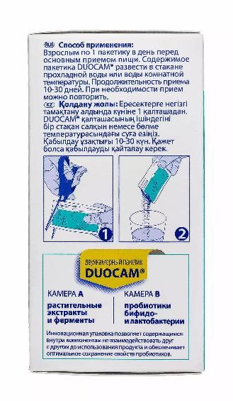 Выпускается в инновационной упаковке - двухкамерных пакетиках Duocam. Каждый пакетик разделен на две части (камеры) A и B, в камере А находятся ферменты и растительные экстракты, в камере B – бифидо- и лактобактерии, это позволяет содержащимся внутри компонентам не взаимодействовать друг с другом до использования продукта и обеспечивает оптимальное сохранение их свойств.