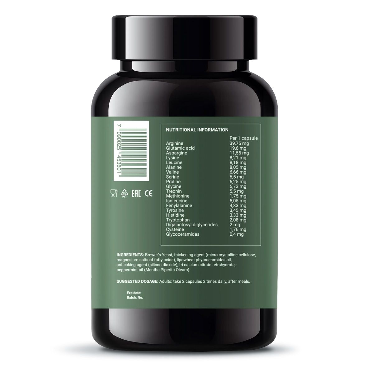 Состав: пивные дрожжи - 300 мг, аргинин - 39,75 мг, глутамин - 19,60 мг, аспарагин - 11,55 мг, лизин - 8,21 мг, лейцин - 8,18 мг, аланин - 8,05 мг, валин - 6,66 мг, серин - 6,50 мг, пролин - 6,25 мг, глицин - 5,73 мг, треонин - 5,50 мг, изолейцин - 5,05 мг, фенилаланин - 4,83 мг, тирозин - 3,45 мг, гистидин - 3,33 мг, триптофан - 2,08 мг, дигалактозил диглицерид - 2,00 мг, цистеин - 1,76 мг, метионин - 1,75 мг, гликоцерамиды - 0,40 мг.