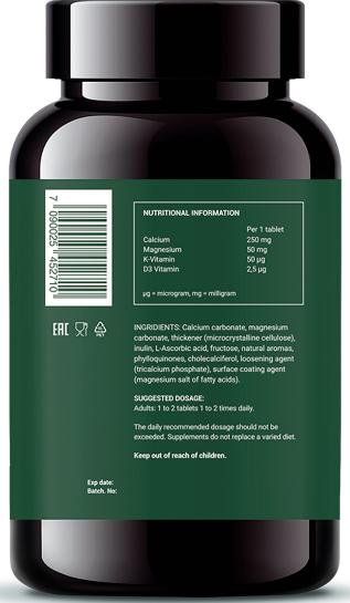 Состав: кальция карбонат, магния карбонат, целлюлоза микрокристаллическая, инулин, кислота аскорбиновая, фруктоза, трикальция фосфат, магния стеарат, ароматизаторы натуральные, филлохинон, холекальциферол.
