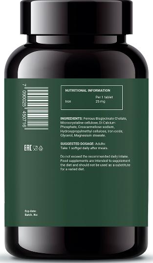 Состав: носитель целлюлоза микрокристаллическая Е460i, бисглицинат железа, стабилизаторы: фосфат кальция Е341ii, карбоксиметилцеллюлоза Е466, гидроксипропилцеллюлоза Е463; краситель оксид железа Е171, носитель глицерин Е422, агент антислеживающий магния стеарат Е470.