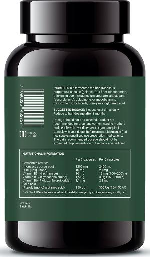 Состав: красный рис (monascus purpureus), желатин, фруктовые волокна, ниацинамид, магния стеарат, кислота аскорбиновая, убихинон, цианокобаламин, пиридоксина гидрохлорид, кислота птероилмоноглютаминовая.