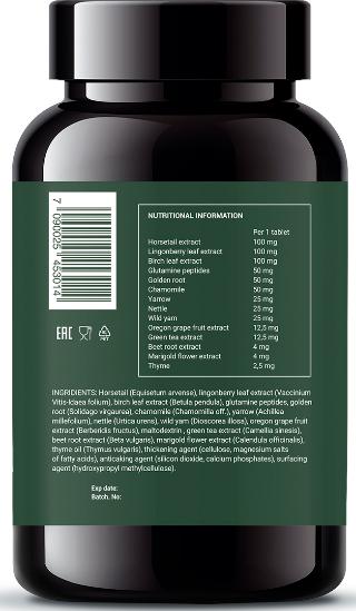 Состав: микрокристаллическая целлюлоза E460i (носитель), экстракт хвоща полевого, экстракт листьев брусники, экстракт листьев березы повислой, мальтодекстрин, глютаминовые пептиды, золотарник, ромашка лекарственная, тысячелистник обыкновенный, крапива жгучая, дикий ямс, экстракт плодов барбариса, экстракт зеленого чая, магниевые соли жирных кислот E470b (эмульгатор), диоксид кремния E551 (антислеживающий агент), фосфат кальция E341 (стабилизатор), экстракт корня свеклы, экстракт календулы, тимьян, гидроксипропилметилцеллюлоза E464 (загуститель) .