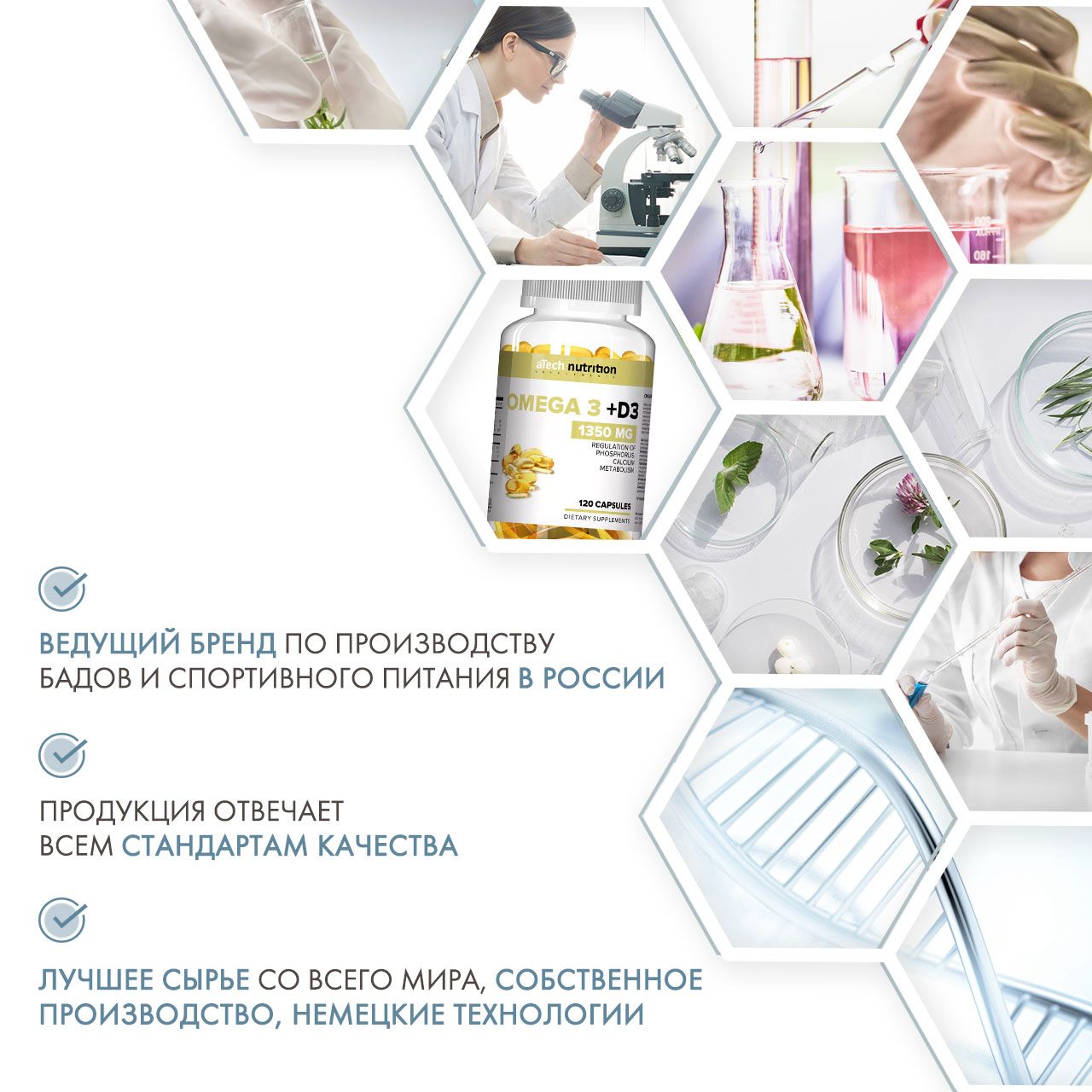 Витаминный комплекс насыщен жизненно важными жирными кислотами омега-3 рыбный жир с добавлением витаминов D3, необходимых для нормальной функции клеток, метаболизма белков, жиров, углеводов и электролитов, роста и развития организма. Комплекс направлен на улучшение состояния кожи, зрения, функционирование головного мозга и сердечно-сосудистой системы.