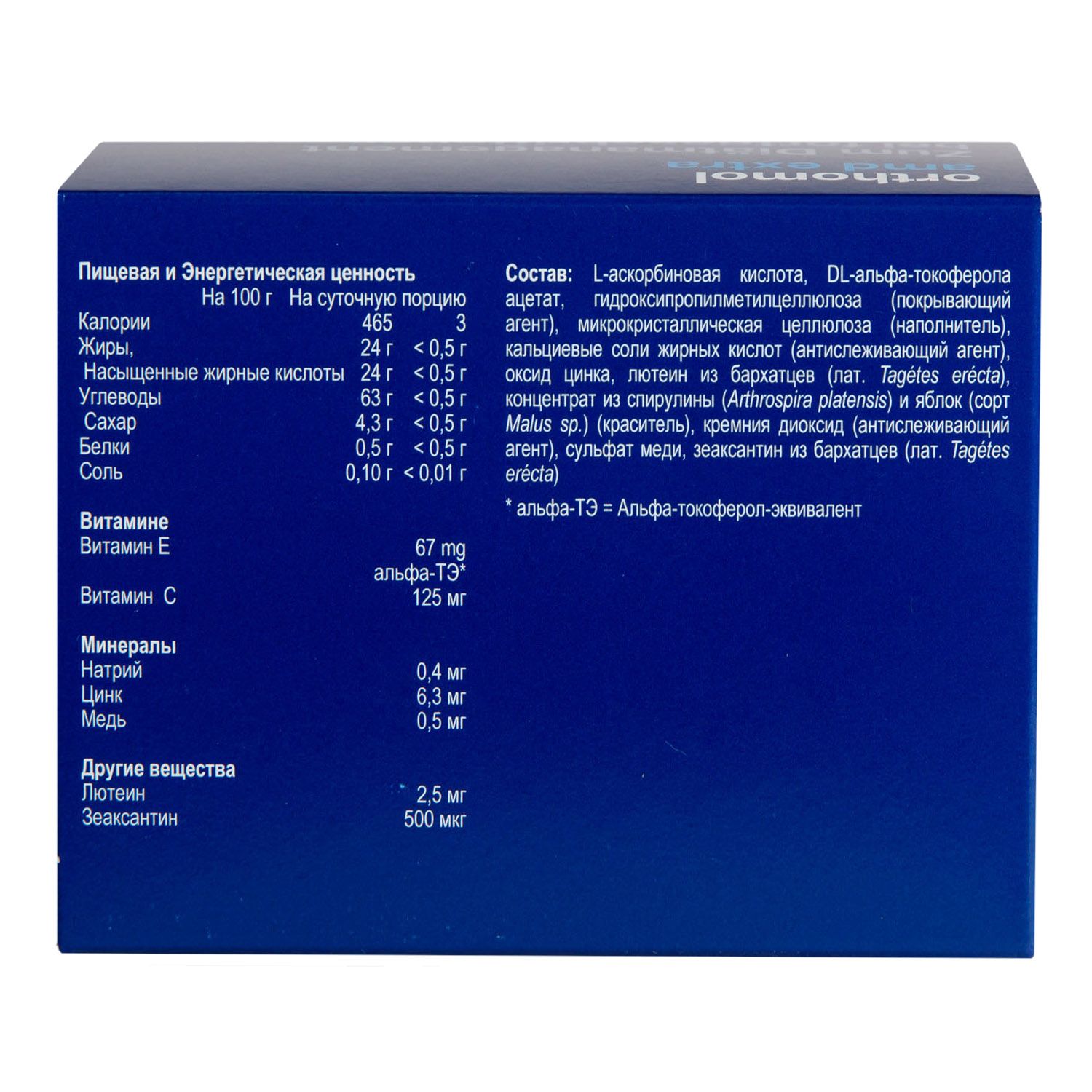 Состав: L-аскорбиновая кислота, DL-альфа-токоферилацетат, покрывающий агент гидроксипропилметилцеллюлоза, наполнитель микрокристаллическая целлюлоза, антиадгезив, кальциевые соли жирных кислот, оксид цинка, экстракт бархатцев прямостоячих , содержащий лютеин , концентрат красителя из спирулины ( Arthrospira platensis ) и яблока ( Malus. sp. ), антиадгезив диоксид кремния, сульфат меди, зеаксантин (из Tagetes erecta ).