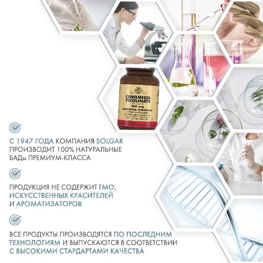 Капсулы с содержанием Пиколинат хрома разработаны американской компанией Solgar. Является биологически активной добавкой (БАД). Назначение - помогает нормализовать уровень сахара, триглицеридов и холестерина способствует выработке инсулина, уравновешивает его выделение в течение дня и нормализует уровень сахара в крови, необходим при нарушениях углеводного обмена, помогает снижению лишнего веса, увеличивает рост мышц и улучшает процесс сжигания жиров. Является натуральной заменой стероидам для спортсменов, занимающихся развитием своего тела, уменьшает влечение к сладостям и углеводам.