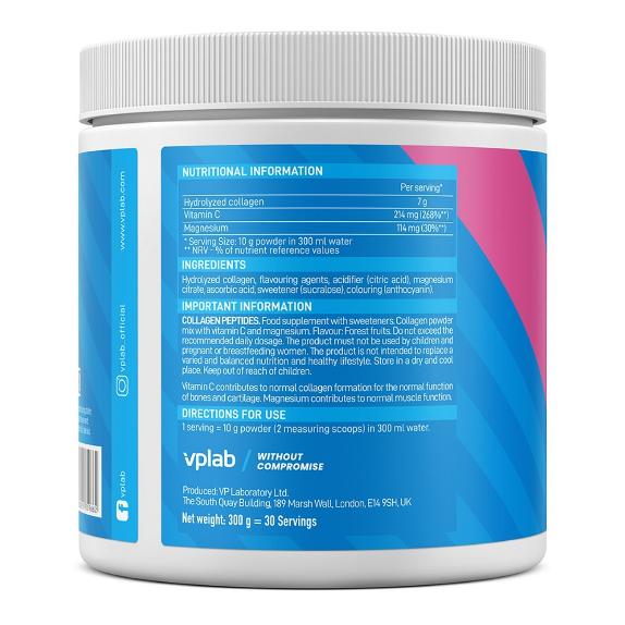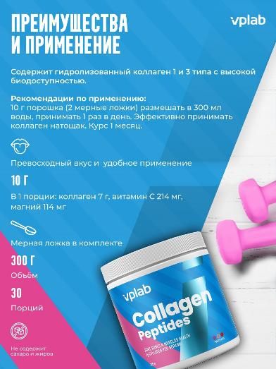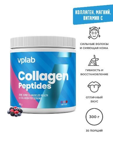 Комплекс VPLAB Collagen Peptides для вашей красоты и здоровья содержит гидролизованный коллаген 1 и 3 типов высокой биодоступности. Формула усилена витамином С, поддерживающим иммунитет и бодрость, и магнием для спокойствия и хорошего настроения.