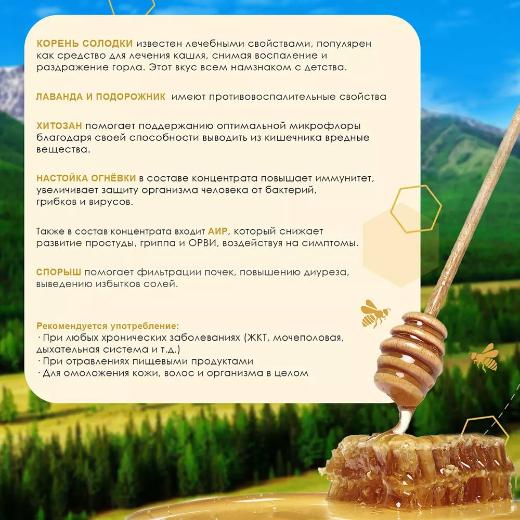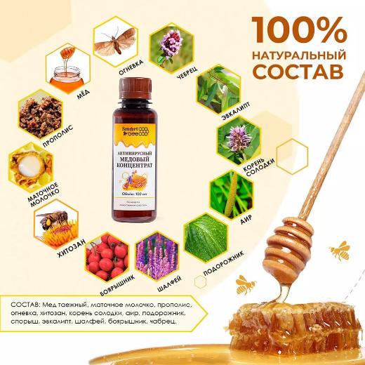 Антивирусный медовый концентрат создан из продуктов пчеловодства и лекарственных трав. Предохраняет организм от воздействия вирусов и инфекций и восстанавливает защитные функции организма. Не является лекарственным средством.