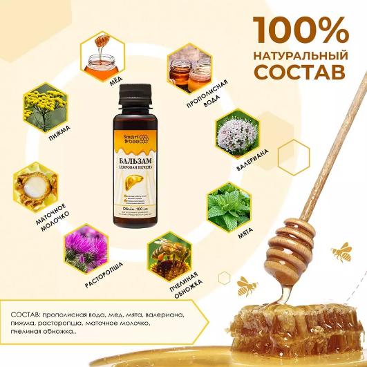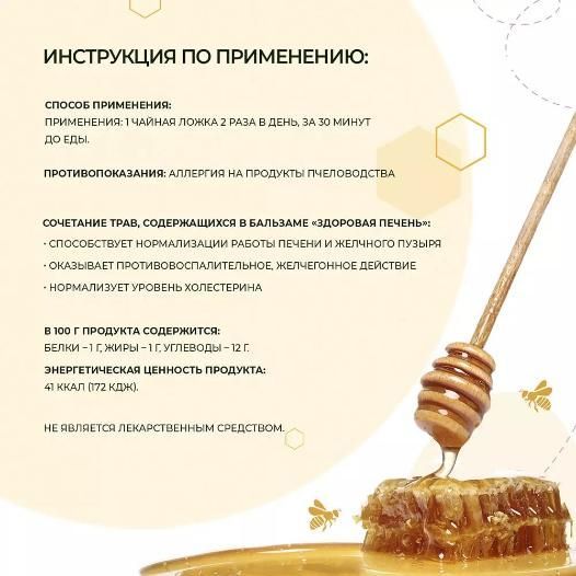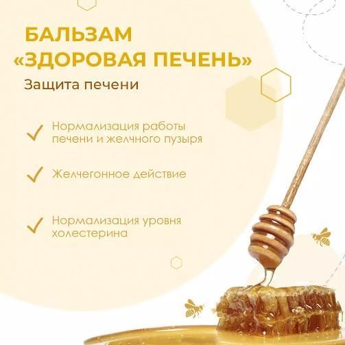 Бальзам «Здоровая печень» разработан для профилактики и лечения заболеваний желчевыводящей системы. Сочетание трав и продуктов пчеловодства способствует нормализации работы печени и желчного пузыря, оказывает противовоспалительное, желчегонное действие и нормализует уровень холестерина. Не является лекарственным средством.