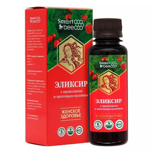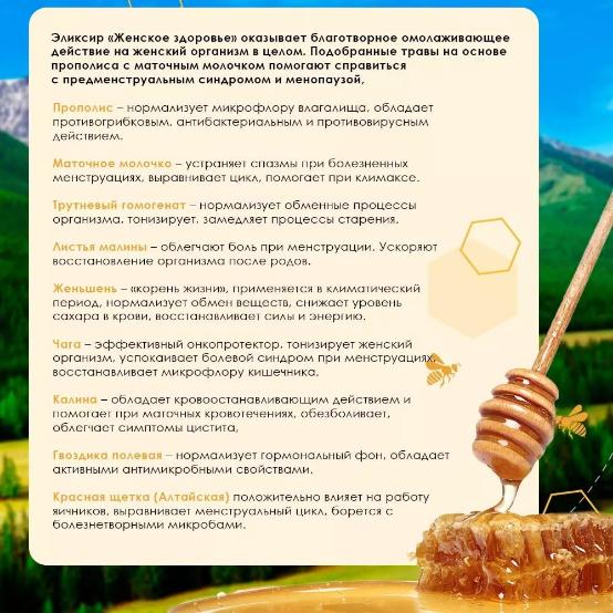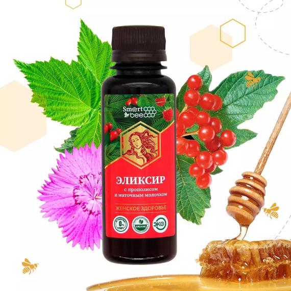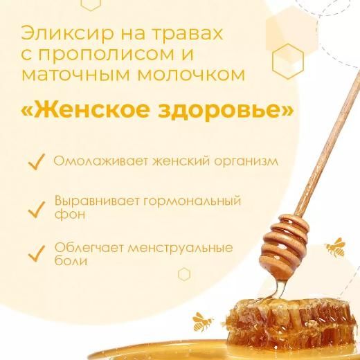 Эликсир «Женское здоровье» оказывает благотворное омолаживающее действие на женский организм в целом. Подобранные травы на основе прополиса с маточным молочком помогают справиться с предменструальным синдромом и менопаузой. Не является лекарственным средством.