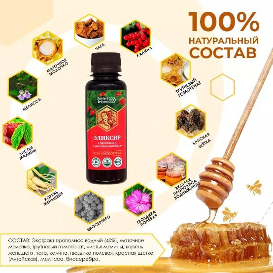 Состав: экстракт прополиса водный (40%), маточное молочко, трутневый гомогенат, листья малины, корень женьшеня, чага, калина, гвоздика полевая, красная щетка (Алтайская), мелисса, биосеребро.