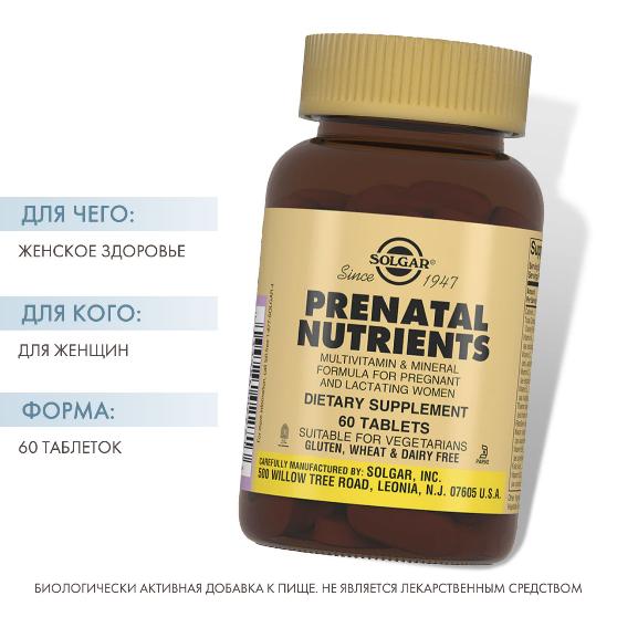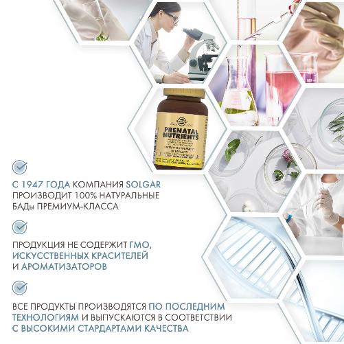 Таблетки «Солгар-Пренатабс» разработаны американской компанией Solgar. Являются биологически активной добавкой (БАД). Назначение - мультивитамин, который удовлетворяет все потребности материнского организма в питательных веществах, что положительно сказывается на развитии плода и здоровье женщины. «Солгар-Пренатабс» содержит «мягкое» железо, кальций, фолиевую кислоту и цитрат магния, которые обеспечивают нормальное развитие нервной системы и костной ткани плода. Содержащий исключительно натуральные компоненты, мультивитамин предотвращает повышение давления и токсикацию, часто встречающуюся у беременных женщин.