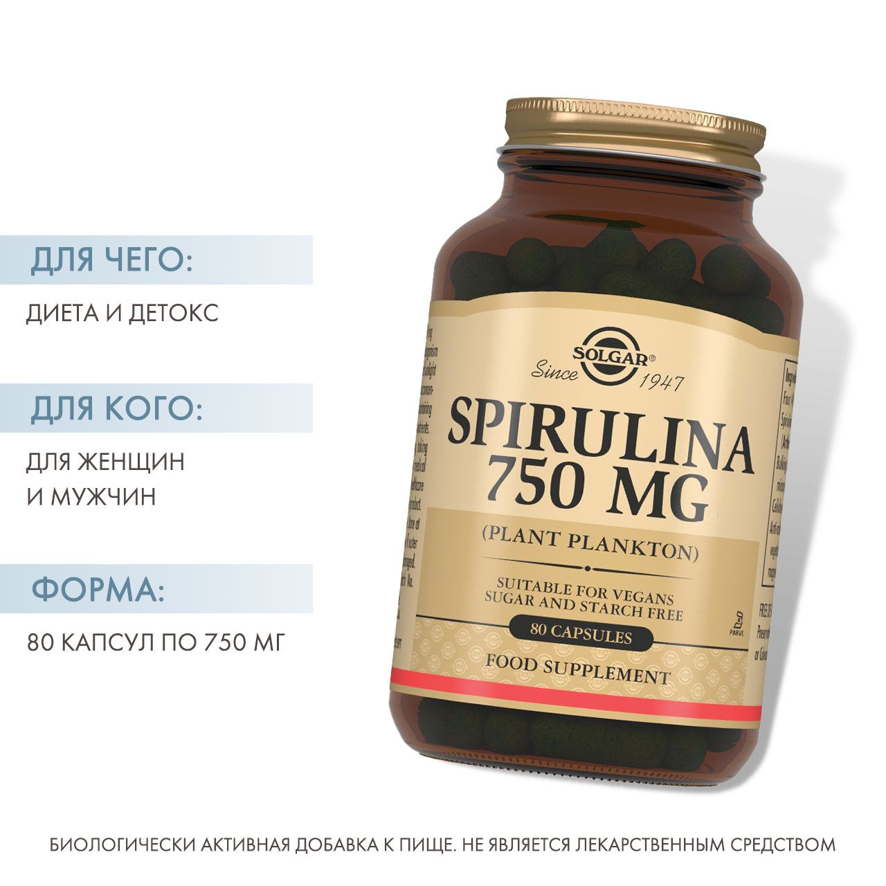 Капсулы спирулина 750 мг рекомендуются в качестве биологически активной добавки к пище - дополнительного источника витамина А (бета-каротина), витамина В12, источника фикоцианинов.