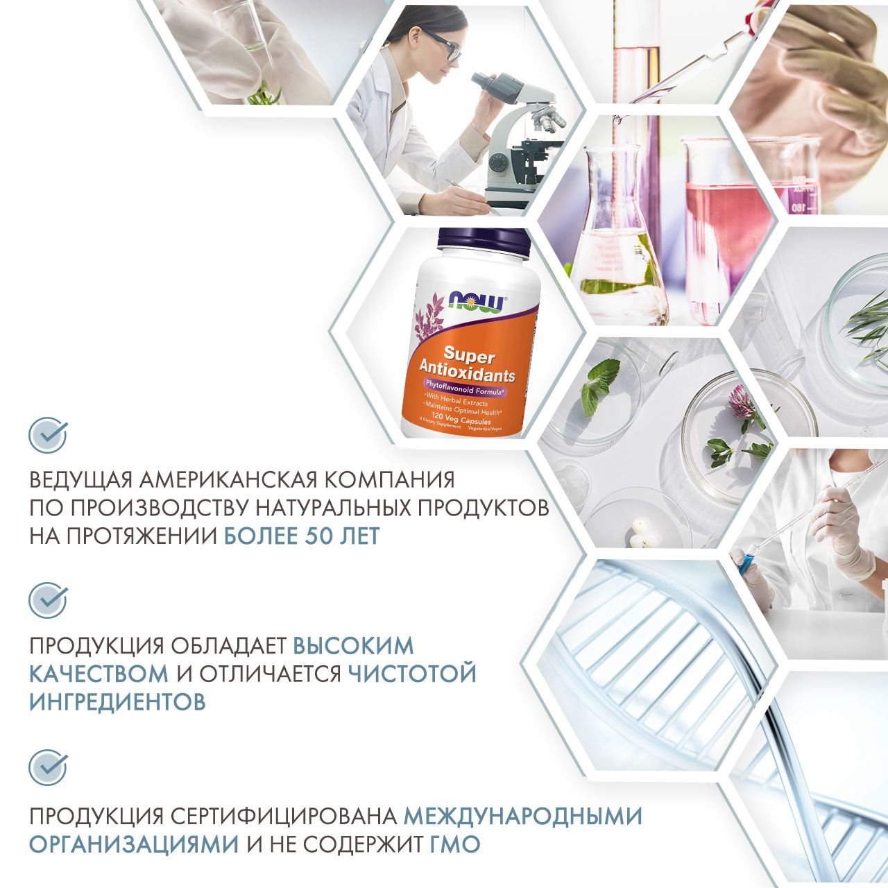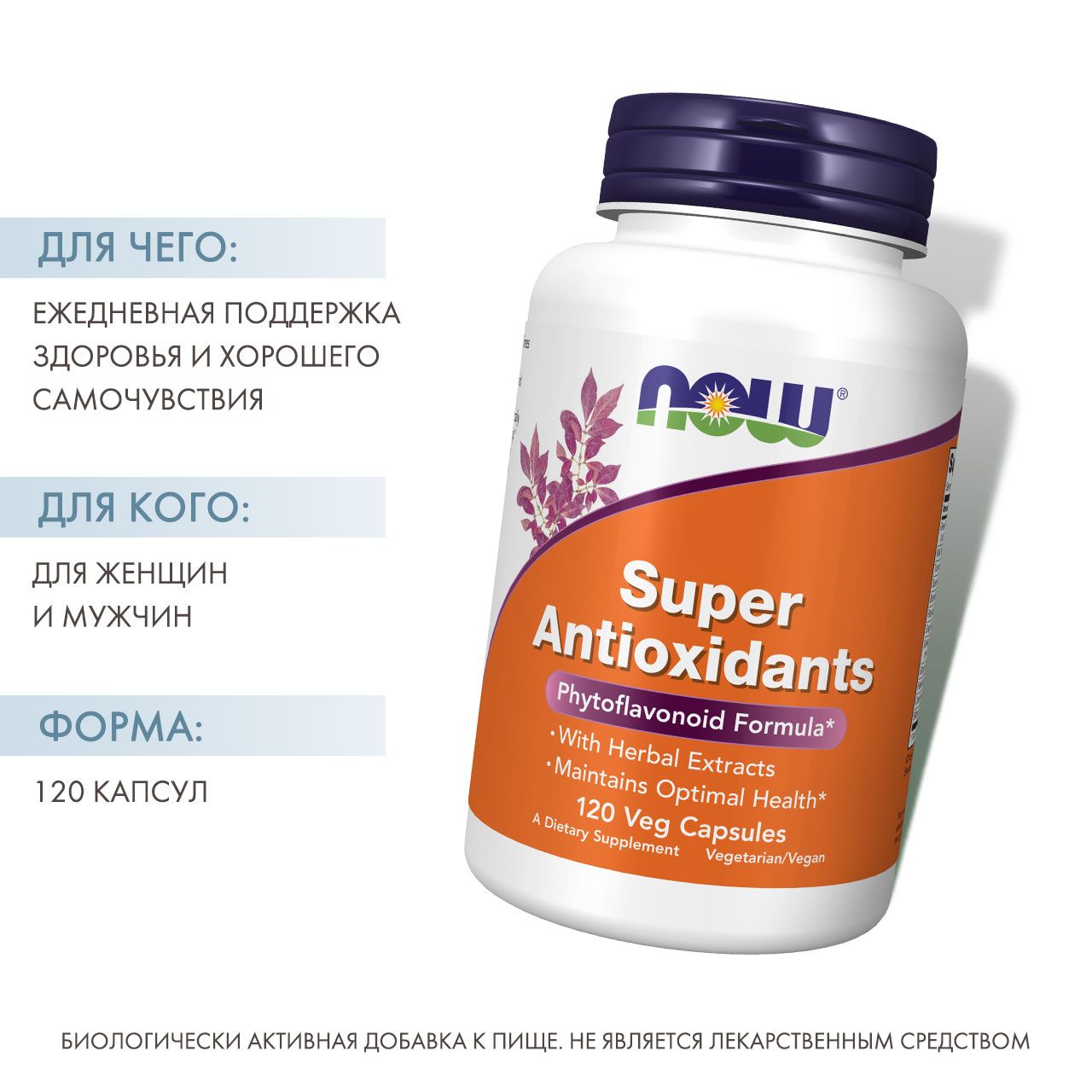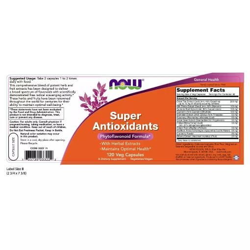 NOW Супер антиоксиданты – это комплекс мощных экстрактов трав и плодов, который разработан для доставки организму широкого спектра флавоноидов: дигидрокверцетина, силибина, антоцианов, куркумина, арбутина и гингерола. Научно подтверждена активность флавоноидов в нейтрализации свободных радикалов. Травы и плоды, входящие в состав, веками славились во всем мире своей способностью поддерживать оптимальное самочувствие и нормальное функционирование человеческого организма.