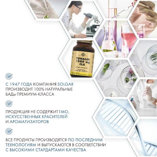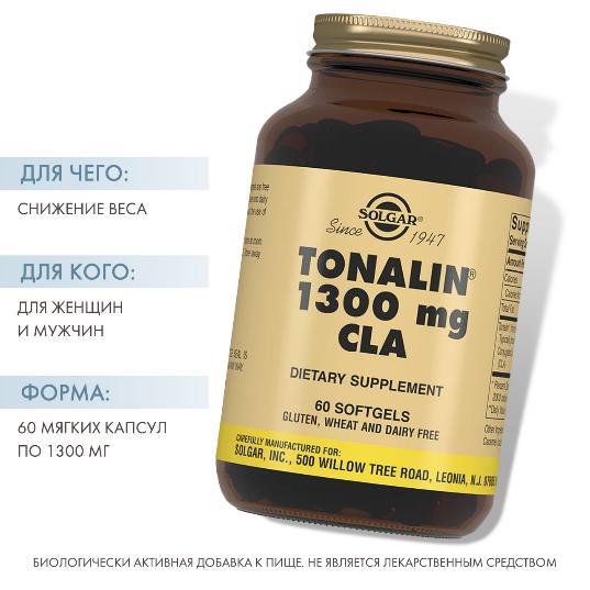 Капсулы Тоналин разработаны американской компанией Solgar. Является биологически активной добавкой. Назначение - стимулирует жировой обмен, способствует преобразованию жировой ткани в АТФ. Снижает уровень плохого холестирина, регулирует углеродный обмен, применяется в программах по снижению и сохранению веса.